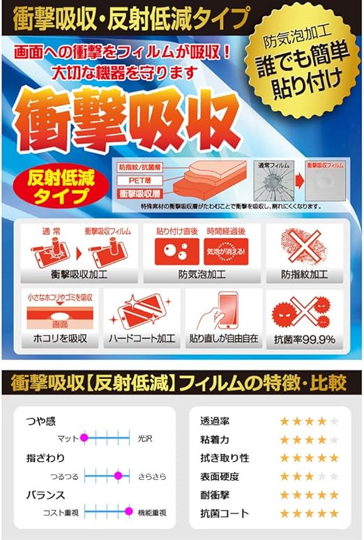 特殊素材の衝撃吸収層が外部からの衝撃を吸収し、機器へのダメージをやわらげます。『衝撃吸収(非光沢)の保護フィルム』