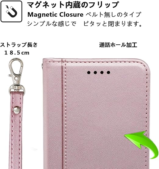 【機能性2:ストラップ付き】ストラップホール付きです。スマホカバーと同じの色合いを持つスプリングシャックル式のハンドストラップも同梱販売です。取替が易くて使い勝手が良いのです。ストラップの長さ:18.5cm。やは