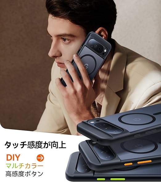 TORRAS Google Pixel 10 Pro XL 用 ケース【米軍規格・Magsafe対応】衝?吸収 ワイヤレス充電対応 半透明 黄変防止 防指紋 滑り止め エアバッグクッション 搭載マグネット 磁石 カラー交換可能ボタン Guardian-Mag ブラック a