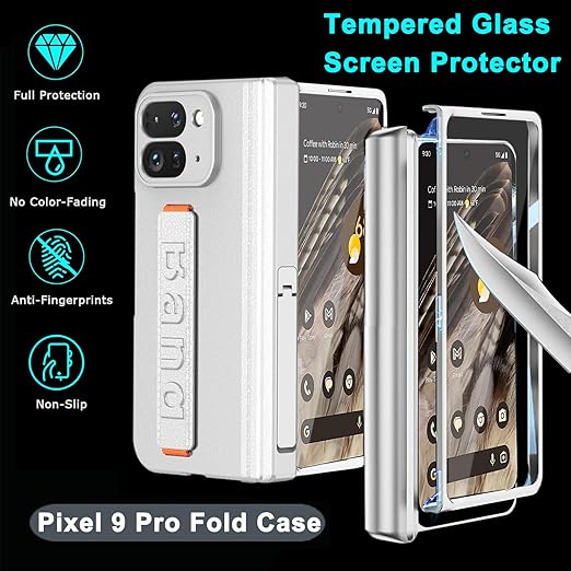 NINKI適応 Google Pixel 9 Pro Fold ケース 格納式リストバンド ヒンジ保護 キックスタンド 折り畳み式 PC製品 スクリーンフィルム一体型 ワイヤレス充電対応 グーグル ピクセル 9プロ フォールド 5G スマホ 保護カバー アクセサリー (シルバー) a