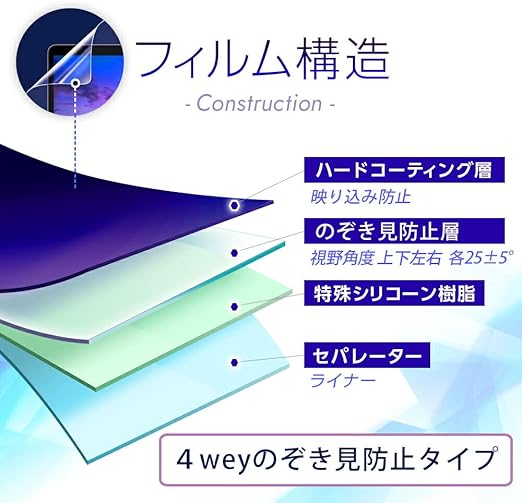 ★上下左右4方向(視野角60度)からの視野を制限する特殊ブラインド加工が施されており、周りからの視線を防ぐプライバシー保護フィルムです。(透過率62%)
