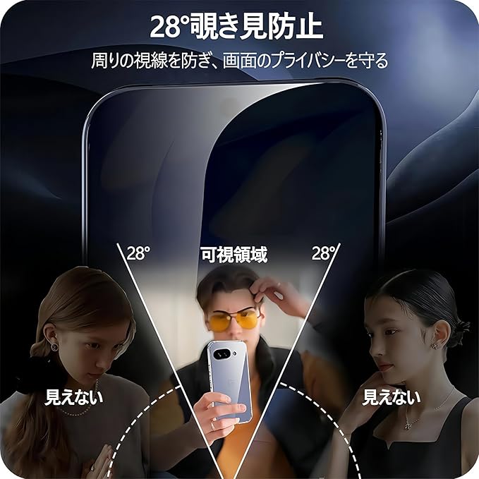 「覗き見防止・プライバシーを常に守る」覗き見防止技術(ブラインド技術)を搭載され、視野角度が左右約28°となり、28°を超えると画面が真っ黒になります。左右の視野からの視線を防ぎ、画面のプライバシーを守ります。例えば、電車、エレベーター、地下鉄の中でメッセージを確認する場合に、周りからの覗き見を心配せずにLINEやメールの交換も安心できます。ブラインド加