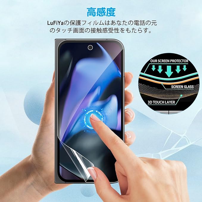 高感度&高透過率:クリア度の高いTPU素材を使用することでまるで何も貼っていないかのような透き通る美しさの液晶画面の状態でご使用いただけます。 耐久性のある特殊構造のTPU素材のフィルムが衝撃を緩和させあらゆる衝撃から端末の液晶画面をしっかり保護します