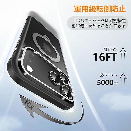 【新型・進化型TPUバンパー & 耐衝撃保護】iPhone 17 Pro Max 用 ケースは、新型進化型TPUバンパー構造を使用し、4隅にエアクッションを配置し、30,000回1.5mの落下クリアし、MIL-STD-810G認証取得、特殊環境下でも確実な保護性能を発揮しています。TPUとポリカーボネートの複合構造が、スマートフォンのカメラモジュールを全方位から保護、携帯落下時の衝撃からも安心しています。このiPhone17 Pro Maxケース画面縁は0.5mm隆起設計で転倒時の直接接触を防止