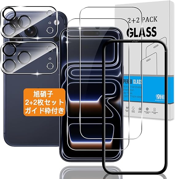 【2+2枚セット ガイド枠付き】 対応 iPhone 17 Pro ガラスフィルム + カメラ保護フィルム 【日本旭硝子 硬度9H】 アイフォン17Pro 用 フィルム 強化ガラス 液晶 いphone17pro 用 保護フィルム 3D Touch対応 、高透過率 、気泡ゼロ 、飛散防止 、高感度 、衝撃吸収 、指紋防止 、ラウンドエッジ加工 、簡単貼り付け a