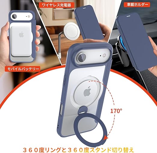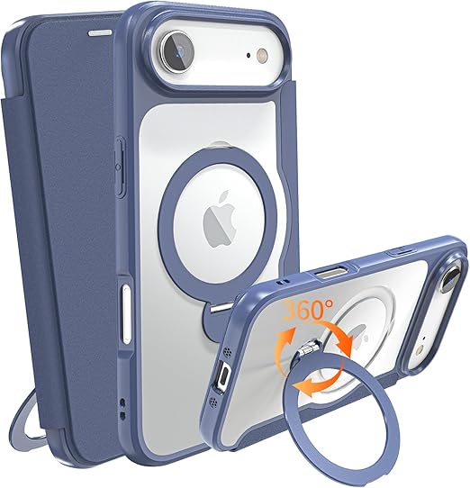IIKAYO iPhone 17 Air 用 ケース 手帳型 カード収納 背面クリア MagSafe対応 リング付き 360°回転スタンド軽い 薄型 耐衝撃 全面保護 縦横両対応 レザー素材 マグセーフ対応 おしゃれ 青 a