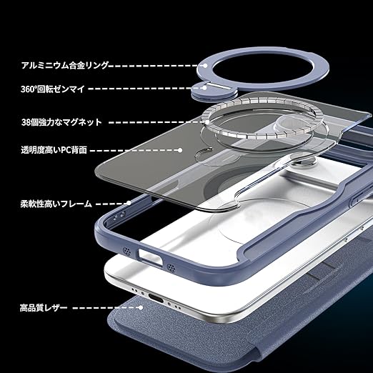 【ニーズにちょうど応える製品】手帳型、背面クリア、MagSafe、可回転リングと欲しい要素が全て詰まってて品質も手頃でした、色合いはホームページイメージ通り,作りもしっかりしています、背面のマグネット部分がひんやりしていて触れると気持ちいいです。とても丈夫なのでアウトドア系に向いてると思い製造しております。外仕事に最適です。