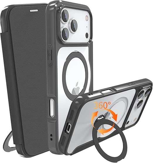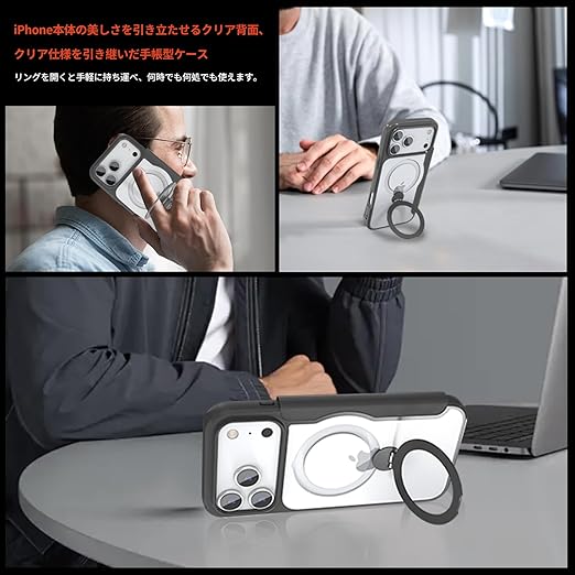 IIKAYO iPhone 17 Pro 用 ケース 手帳型 カード収納 背面クリア MagSafe対応 リング付き 360°回転スタンド 軽い 薄型 耐衝撃 全面保護 縦横両対応 レザー素材 おしゃれ 黒 a