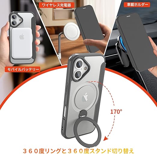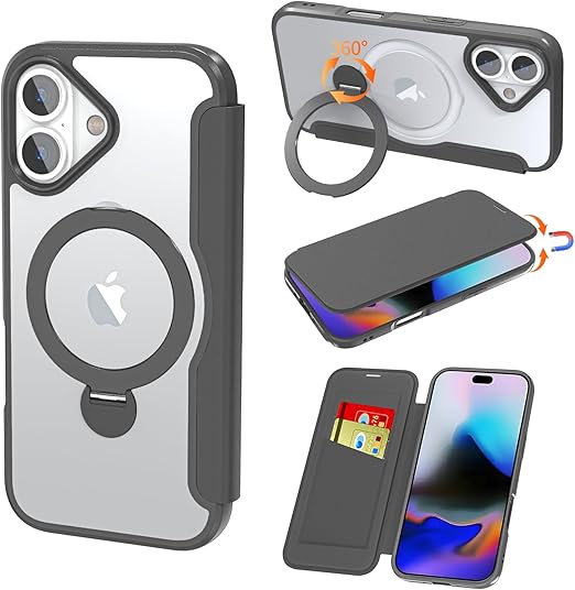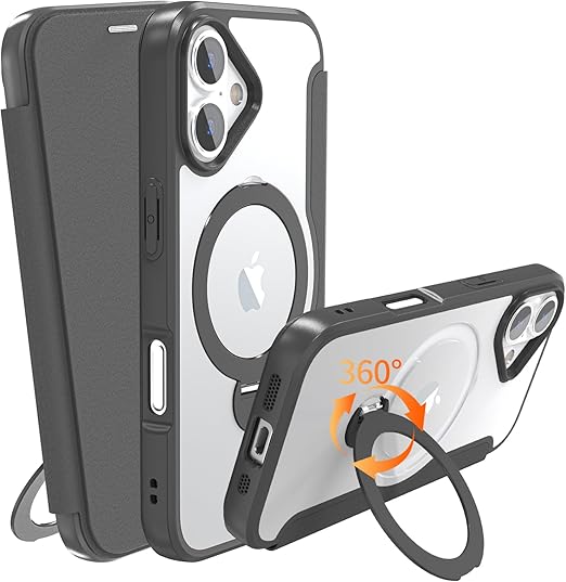 IIKAYO iPhone 17 用 ケース 手帳型 カード収納 背面クリア MagSafe対応 リング付き 360°回転スタンド軽い 薄型 耐衝撃 全面保護 縦横両対応 レザー素材 マグセーフ対応 おしゃれ 黒 a