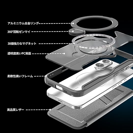 【ニーズにちょうど応える製品】手帳型、背面クリア、MagSafe、可回転リングと欲しい要素が全て詰まってて品質も手頃でした、色合いはホームページイメージ通り,作りもしっかりしています、背面のマグネット部分がひんやりしていて触れると気持ちいいです。とても丈夫なのでアウトドア系に向いてると思い製造しております。外仕事に最適です。