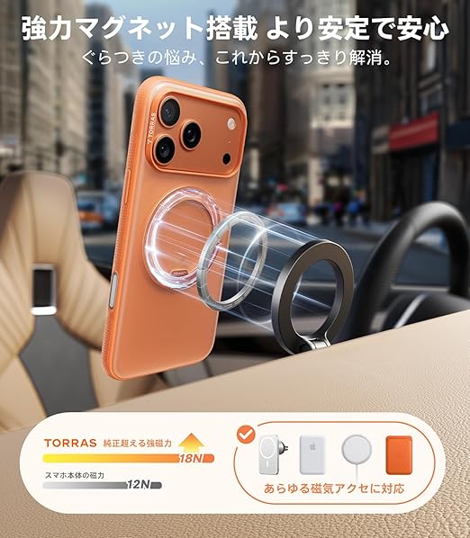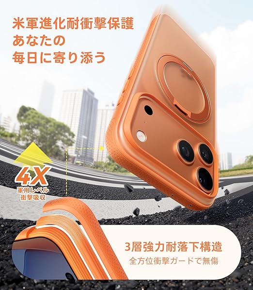 TORRAS iPhone 17 Pro Max 用ケース 【カチカチ・多機能360度回転スタンド】リング Ostand O3 Fitness MagSafe対応 米軍MIL規格耐衝撃 スタンド 指紋防止 黄変防止 カメラコントロールボタン付き ストラップホール 半透明 撮影/動画視聴/日常の記録 手のひらサイズの映像革命 オレンジ色 a