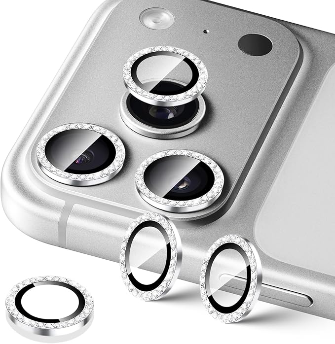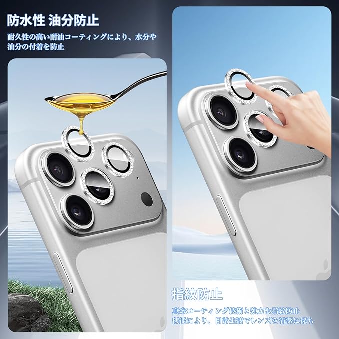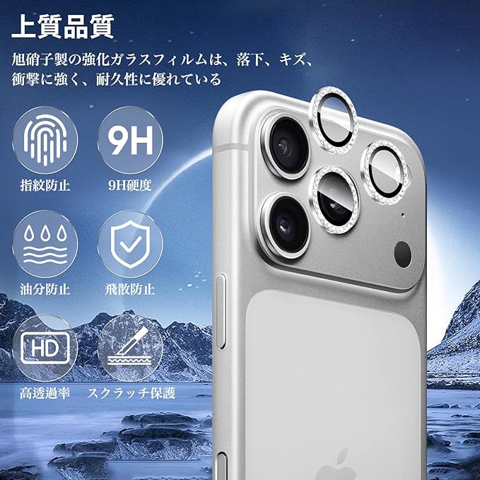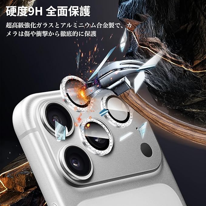 For iphone 17 pro/pro max カメラフィルム キラキラ カメラ保護 9H強度 アルミ合金 黒縁取り 高透過率 耐衝撃 飛散防止 キズ防止 高透過率 指紋・汚れ防止 気泡ゼロ 露出オーバー防止 簡単貼り付け 対応 iphone 17 pro/pro max レンズ保護フィルム(シルバー) a
