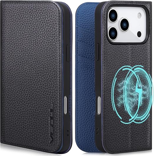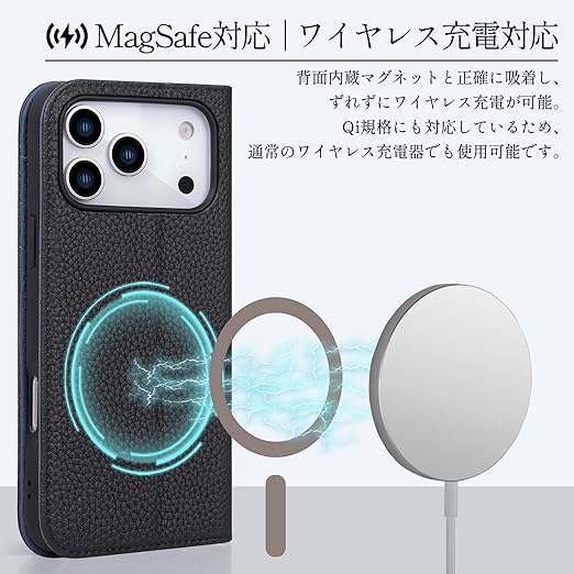 VISOUL iPhone 17 Pro 対応 ケース 手帳型 本革 アイフォン17 プロ 手帳型ケース MagSafe対応 スマホケース レザー カード収納 携帯カバー 横置きスタンド機能付き マグネット式 全面保護 柔軟なTPU素材 アイホン17 Pro ブラック・ネイビー a