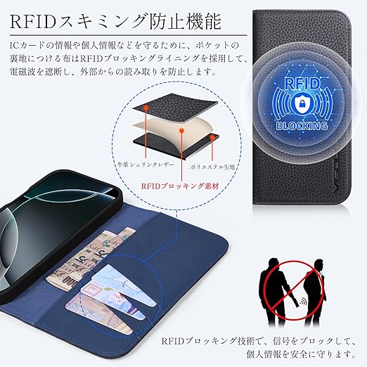 RFIDブロッキング技術・選ばれる理由:ICカードの情報や個人情報などを守るために、カードスロットとポケットの裏地につける布はRFIDブロッキングライニングを採用しています。カードを入れたまま、反応しない場合があり、使用する時はカードを出してから、利用してお願い致します。