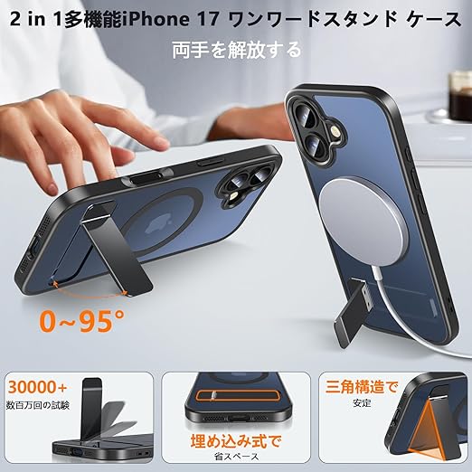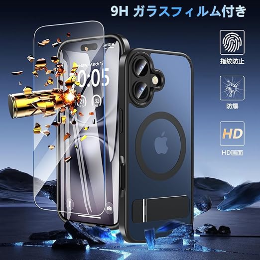 Fin2feel iPhone 17 ケース【MagSafe高速充電対応】ガラスフィルム &スタンド付き 米軍 MIL 耐衝撃認定 耐衝撃・指紋防止・黄ばみ防止 TPU+PC 素材 6.3 インチ専用(ブラック) a