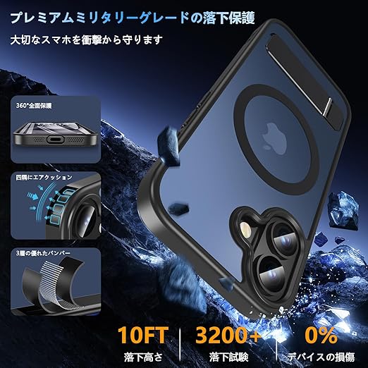 【6.3 インチ専用のしっかりした守り】17 ケースは 6.3 インチ機種にぴったり!アイフォン 17 カバーのボタンは軽く押せて、装着しても自然な感じ。17 保護ケースのカメラは 1.5mm、画面は 1.2mm 高く保護して、机に置いてもキズをしっかり防ぐ。米軍 MIL 規格の17 耐衝撃ケースは 10FT 落下に耐え、衝撃吸収率 90% 以上!子供が持っても、ポケットから落ちても安心。