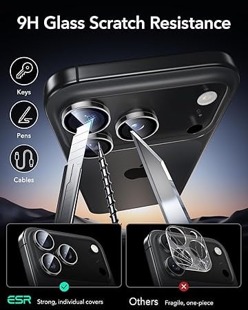 【究極のレンズ保護】このESR iPhone 17 Pro/ 17 Pro Max カメラフィルムの最大50kgの耐衝撃性を持つ高品質の超強化ガラスが、最も過酷な衝撃や擦り傷からもレンズを保護します