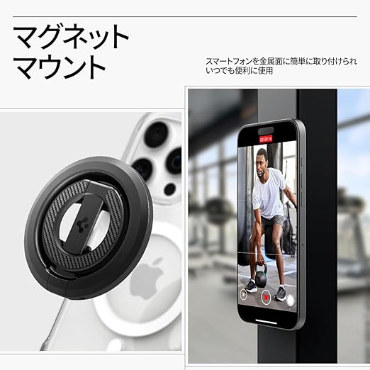 【スマートな活用 ①スマホリング】手にしっかりフィットするグリップとしての使い心地を提供するとともに、マグネット対応スマホリングとしてス