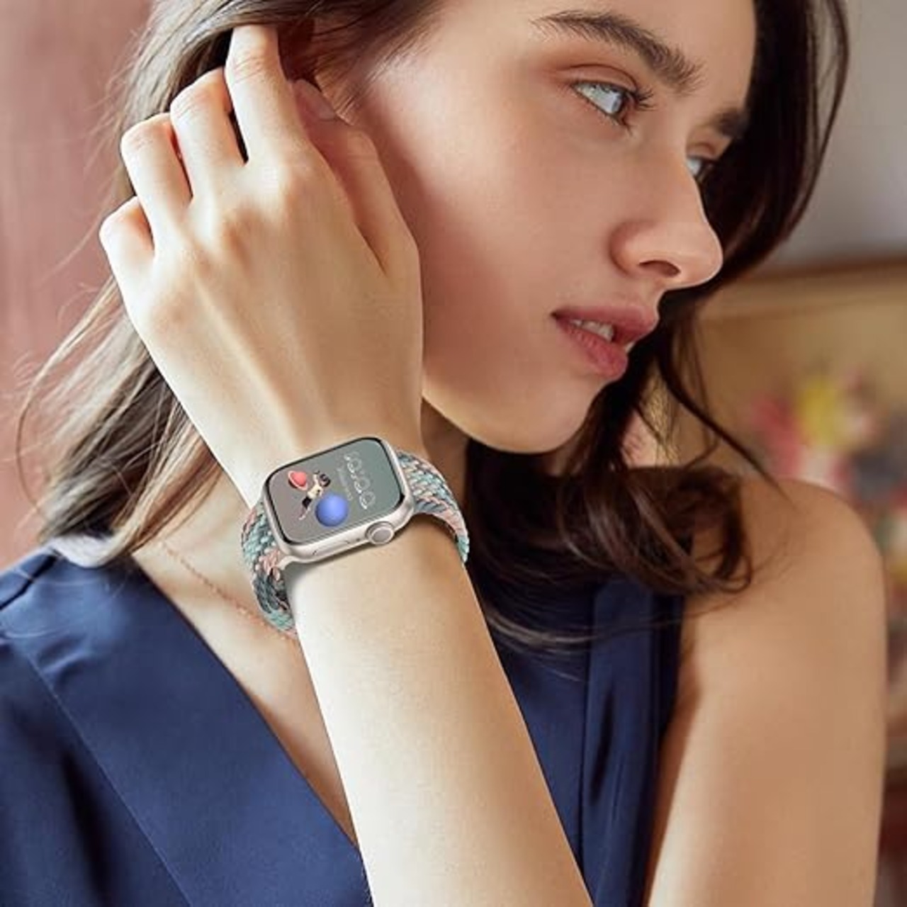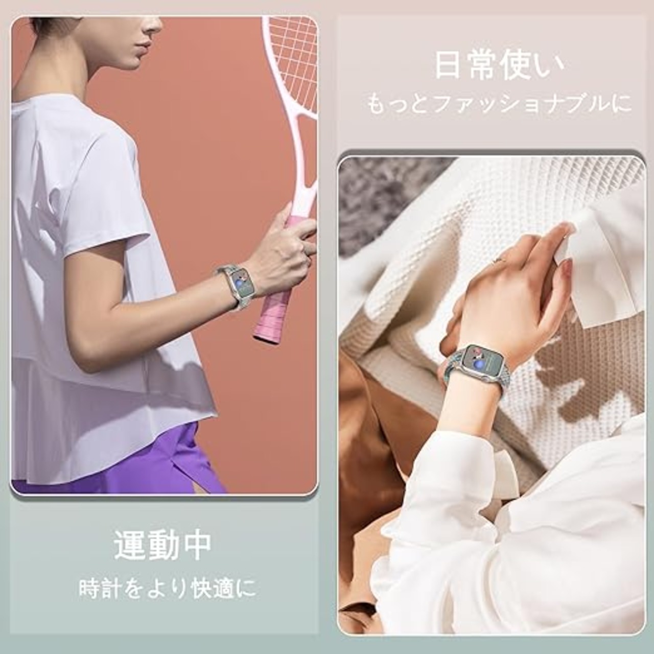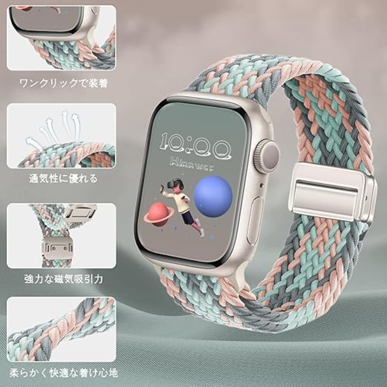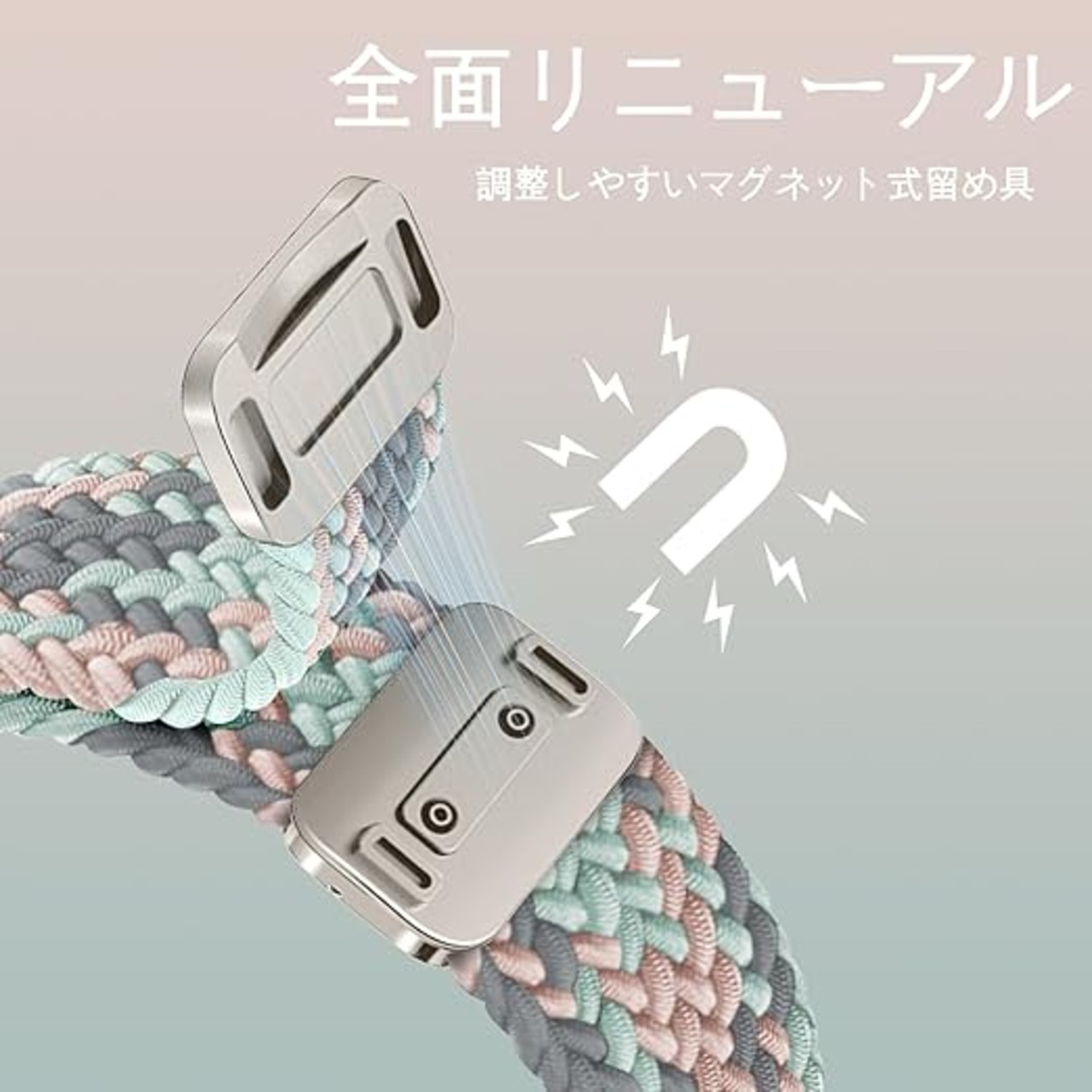 【対応機種】伸縮性のある磁気編みリングバンドは、Apple Watch Series 11 / Series 10 42mm、Apple Watch SE 3 / SE 2 / SE 40mm、Apple Watch Series 9 / Series 8 / Series 7 41mm、Apple Watch Series 6 / Series 5 / Series 4 40mm、Apple Watch Series 3 / Series 2 / Series 1 38mmに適しています。正し