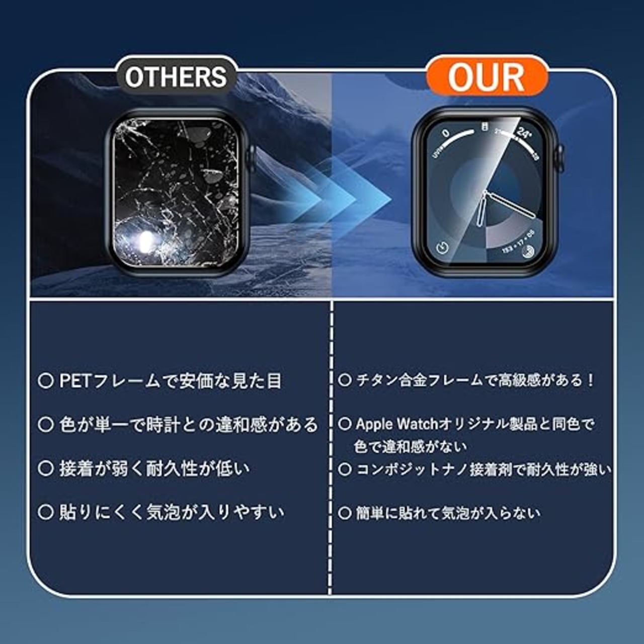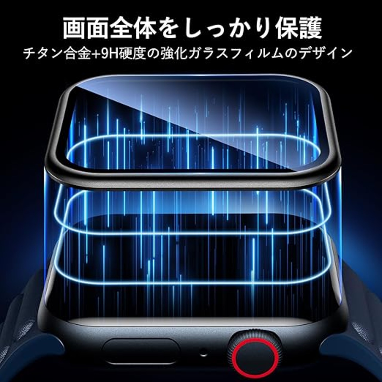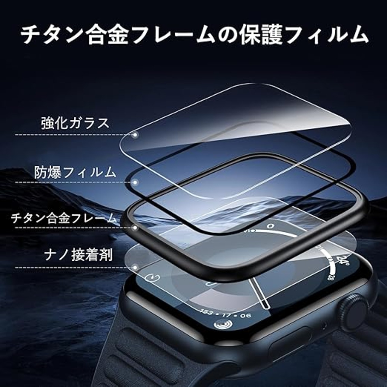 【チタン合金フレームのApple Watch保護フィルム】2024年最新モデルチタン合金フレームのApple Watch保護フィルムは、Apple Watchオリジナル製品と同じ材料のチタン合金+9H硬度の強化ガラスフィルムのデザインを採用し、Apple Watchの画面全体を360度しっかり保護。耐摩耗性、耐衝撃性、衝突に対し画面全体をしっかり保護します。