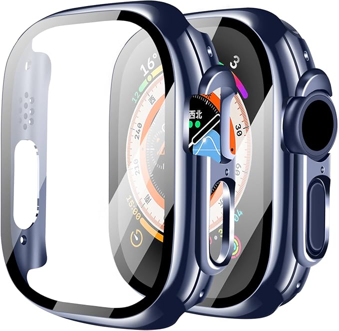 【2024改良ケース】YUGYUG 対応 アップルウォッチ カバー Ultra 2/1 アップルウォッチ ケース PC素材 光沢式 Apple Watch ケース ガラスフィルム 一体型 日本旭硝子材 二重構造 Apple Watch カバー 全面保護 強化ガラス キズ防止(49mm,ブルー) a