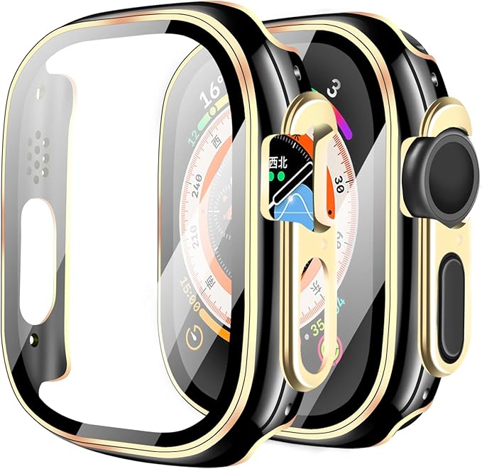 YUGYUG 対応 アップルウォッチ カバー Ultra 3/2/1 アップルウォッチ ケース PC素材 光沢式 Apple Watch ケース ガラスフィルム 一体型 日本旭硝子材 二重構造 Apple Watch カバー 全面保護 強化ガラス キズ防止(49mm,ブラック+ゴールド) a