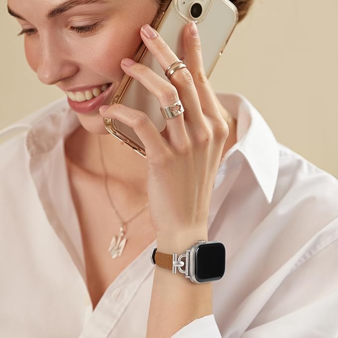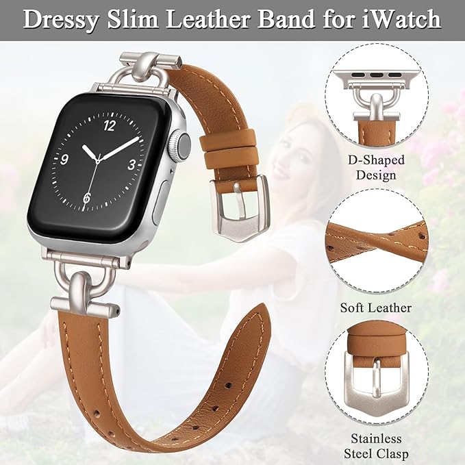 コンパチブル アップルウォッチ バンド スリムレザー製 Apple Watch バンド レディース 女性 iWacth Series 10/9/8/7/6/5/4/3/2/1/SE/Ultra/Ultra2に対応 あっぷるうぉっち 本革 レザー交換バンド iwatch可愛いバンド オシャレベルト(38mm 40mm 41mm 42mm,ブラウン+スターライト)
