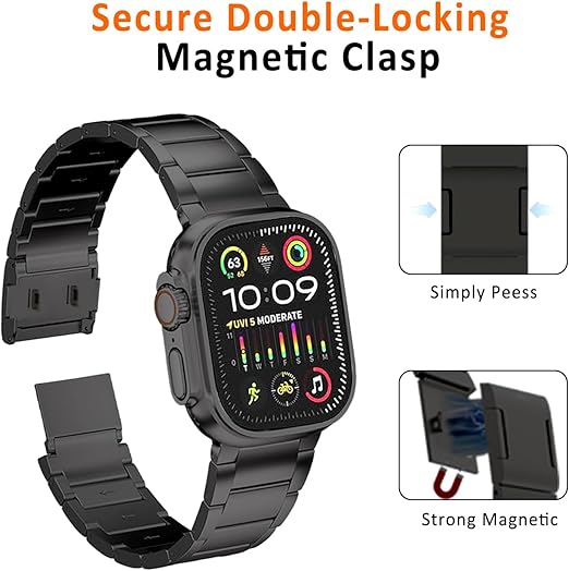 [MaKTech] チタニウムバンド Apple Watch用 - メタルストラップブレスレット(マグネットクラスプ付き)、Apple Watch 10/9/Ultra 2/SE/8/7[2024] 対応 (42mm/41mm/40mm,ブラック) a