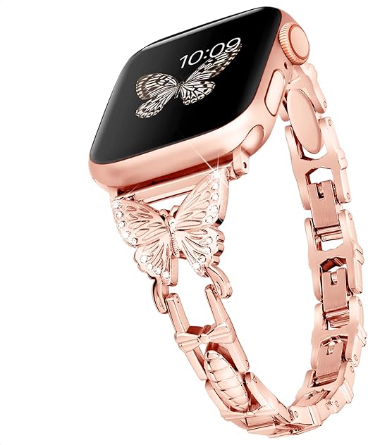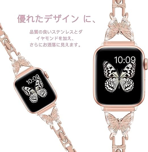 [Daturus] 互換 Apple Watch バンド series10/9/8/7/6/5/4/3/2/1/SE、Ultra対応 アップルウォッチ ベルト ダイヤモンド付きステンレスベルト 金属ベルト アップルウォッチバンド 交換バンド 女性向け お洒落・ファッション バタフライデザイン 工具なし調節可能(46mm/45mm/44mm/(42mm S3/2/1),ローズゴールド) a