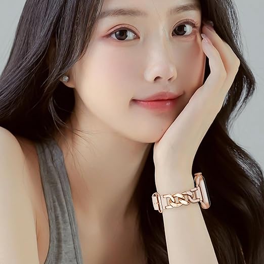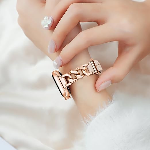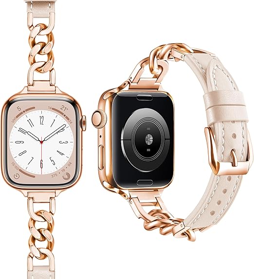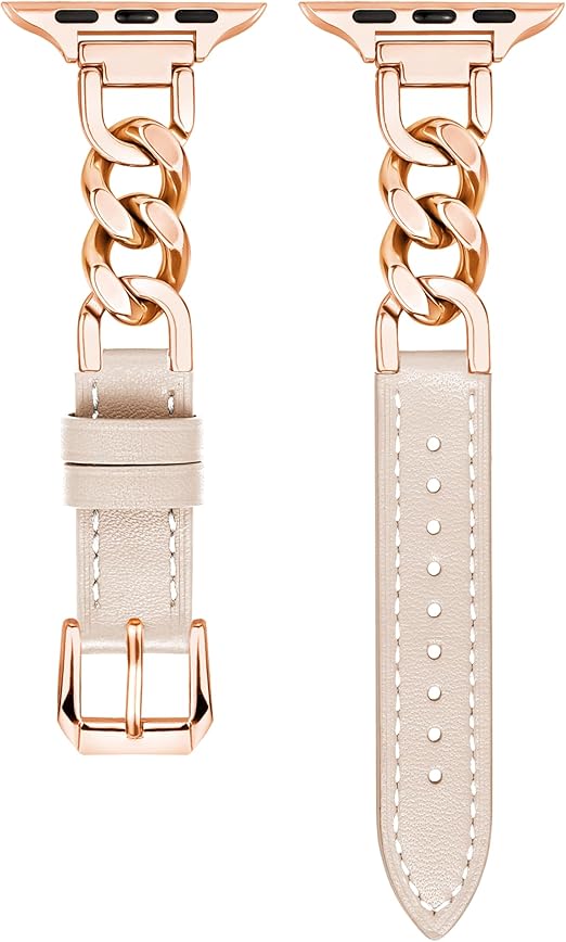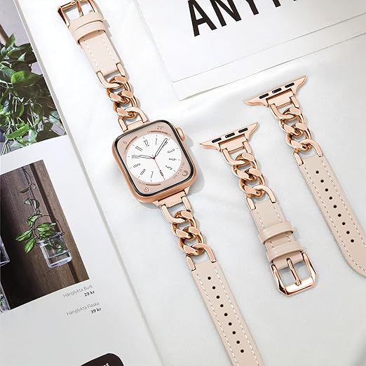 [SIBOYL] 人気細い対応アップルウォッチ バンド46mm 45mm 44mm 49mm 42mm(Series 3/2/1)、カウボーイチェーンステンレスレザあっふウォッチバンド、調整ツール不要、トレンドとクラシックの創造的な組み合わせ、互換性apple watch ベルトレディース、対応Apple Watch 11 10 Se 9 8 7 6 5 4 3 Ultra 3 2 1-ローズゴールド a