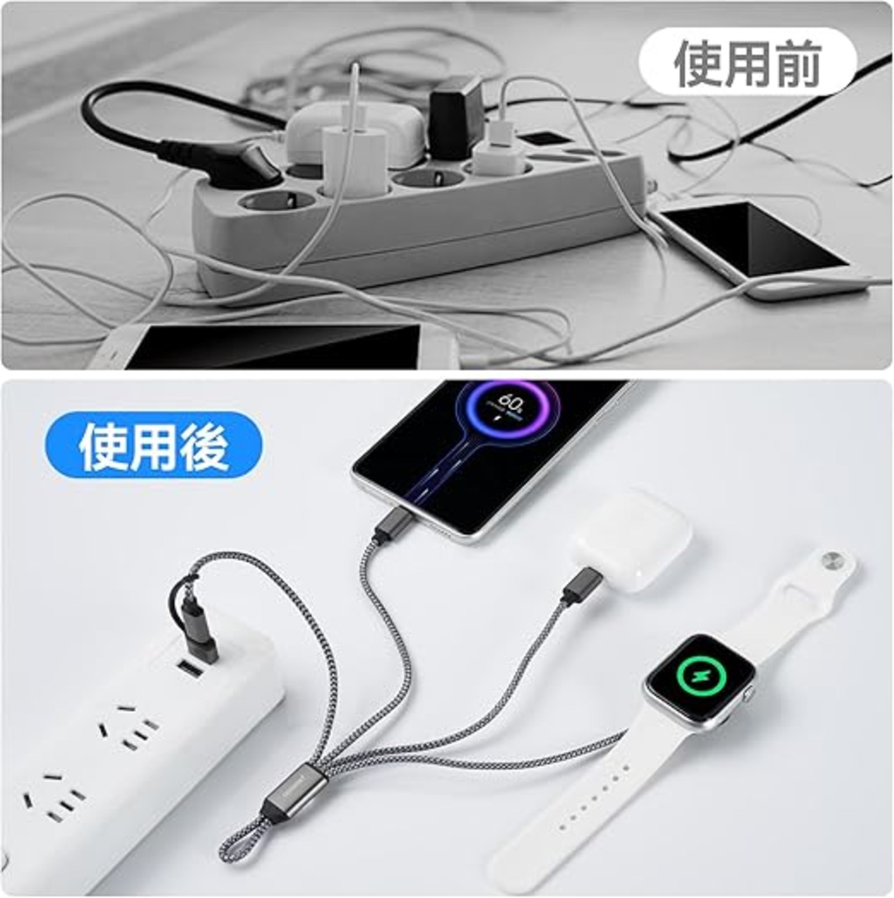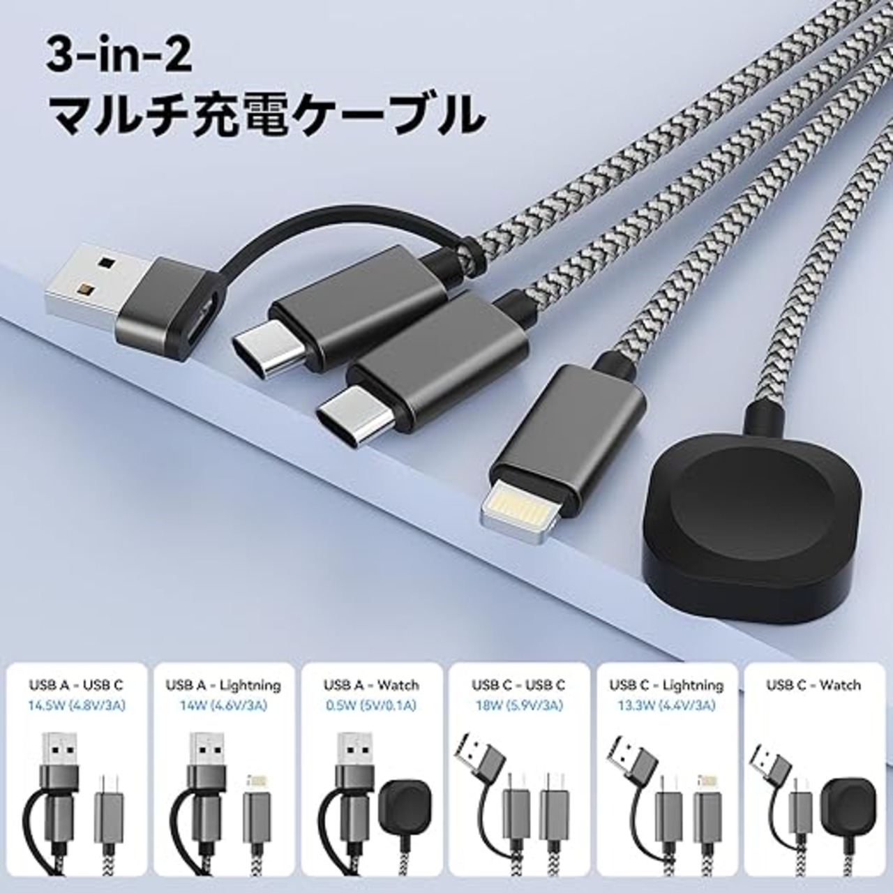 【3 in 2 マルチ充電ケーブル】このマルチ充電ケーブルは、従来の単一充電モードを打破し、2つの入力ポートと3つの出力ポートを備え、USB A - USB C/Lightning/Watch、USB C - USB C/Lightning/Watchなど6つの充電方法を統合しています。3台のデバイスを同時に充電でき、1本のケーブルですべての充電ニーズを満たすことができるため、旅行中の予備充電器として最適です。