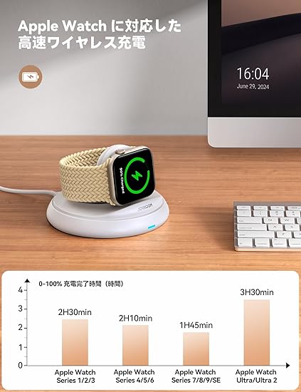 【業界初の革命!0-90°調節可能!より広範囲互換性】:JOYROOMのapple watch充電スタンドは、0-90°調節可能な充電ヘッドは、より大きなiwatchにより安定したサポートを提供します。Apple Watch シリーズ 10/9/8/7/6/5/4/3/2 & SE & Ultra 1/2(38mm、40mm、41mm、42mm、44mm、45mm版を含む)に対応しています。携帯可能な時計充電器には、1.0メートルのUSB C充電ケーブルも付属しています。