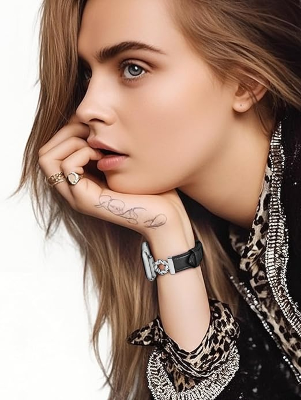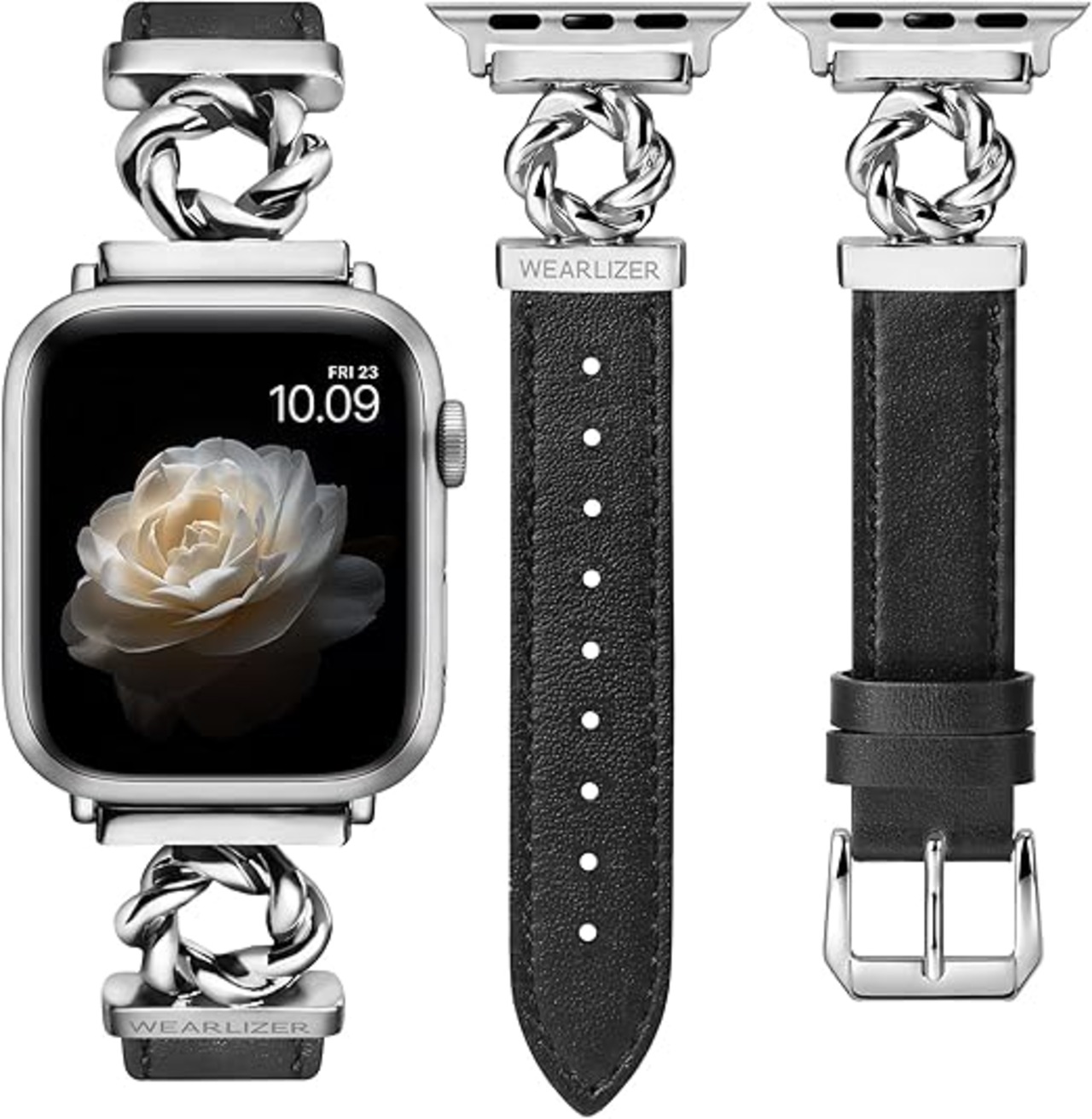 コンパチブル Apple Watch バンド/アップルウォッチ バンド 42/44/45/46/49mm レディース 女性向けあっぷるうぉっち椿花柄本革 レザー交換ベルト 可愛いステンレス オシャレ 柔らかいビジネススタイルストラップ iWatch Series 9/8/7/6/5/4/3/2/1/SE/Ultra/Ultra2に対応(ブラック+シルバー a