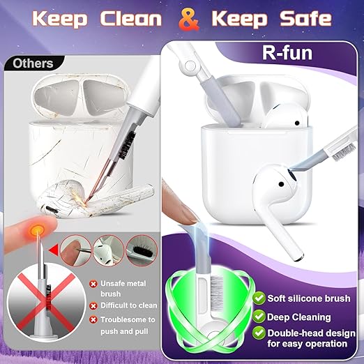 【多機能クリーニングペン】: クリーナーキットにはシリコン製のペン先が付いており、隠れた亀裂や穴の汚れを取り除けます。柔らかいフロックスポンジがワイヤレスイヤホンの充電ケース内の細かいほこりを吸収します。高密度ブラシでイヤホンのサウンドホールの汚れを簡単に掃除できます。