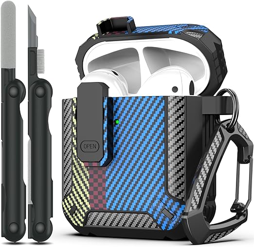RFUNGUANGO Airpods ケース 2 および 1 クリーニングキット付き、Apple AirPods 第 2 世代/第 1 世代充電ケース、キーチェーン付き、落下防止ラッチデザイン、フロント LED 可視、AirPod ケース - カーボンファイバーブルー。 a