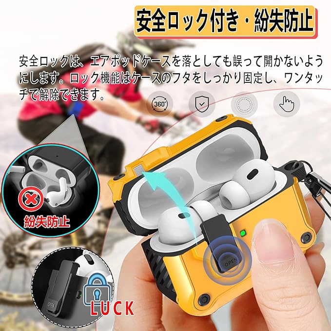 OJBSEN AirPods Pro/Pro2 ケース (2023/2022/2019) AirPods Pro 第1世代/第2世代 ケース 安全ロック付き 自動ボタン ハード TPU えあーぽっつ プロケース エアーポッズプロカバー Magsafe ワイヤレス充電対応 LEDライトが見える カラビナ付き 分離式 全面保護 耐衝撃 傷防止 軽量 対応 エアぽっず プロ カバー (イエロー) a