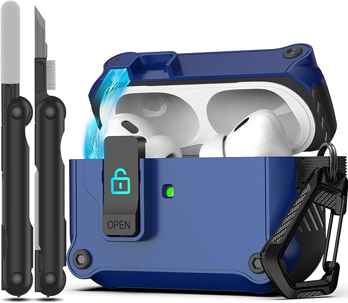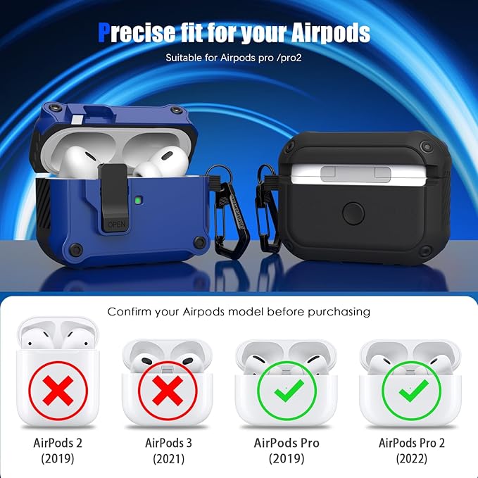 RFUNGUANGO AirPods Pro 第 2/1 世代ケースカバー 安全ロッククリップ付き 自動ポップアップケース フルボディ耐衝撃ハード保護カバー AirPods Pro 2 ケース (2023/2022/2019) 用 - ブルー a
