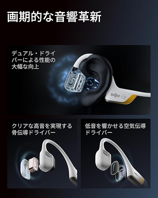 デュアルドライバーによる優れたサウンド:Shokz DualPitchを搭載し、オープンイヤーオーディオのルールを書き換えるShokzのまったく新しいフラッグシップヘッドフォン、OpenRun Pro 2が登場。この先進的なテクノロジーは、骨伝導スピーカーと空気伝導スピーカーを見事に組み合わせ、クリアで力強い音質をお届けします。