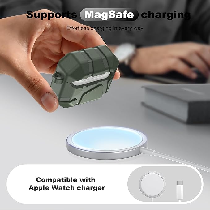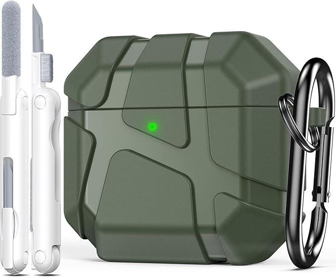 R-Fun AirPods 4用シリコンケース 耐衝撃シリコン保護ケース AirPods第4世代対応 ハードシェルデザイン 傷防止 フロントLEDライト付き カラビナ付き グリーン a