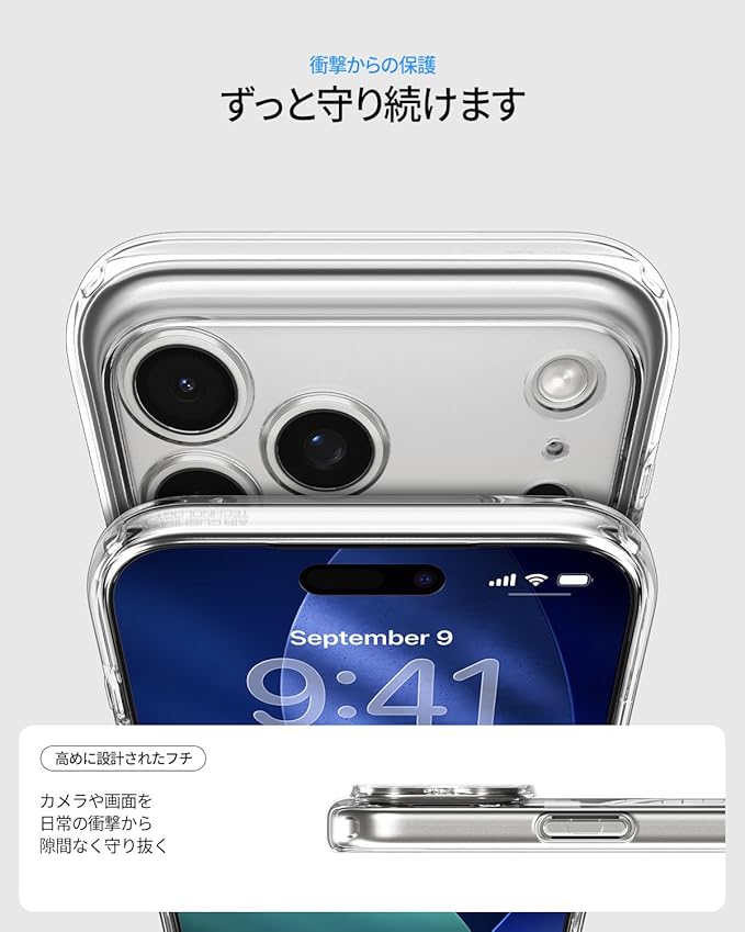 【 高耐久のクリア素材】装脱着が簡単になる柔らかいTPU(熱可塑性ポリウレタン)に丈夫なPC(ポリカーボネート)をハイブリッドさせた2重構造でデバイスを守ります。背面のPCにはUVコーティング、側面のTPUには青いレジンを活用した新素材「デュラクリア」を使い、黄変を最小限に抑制しました。