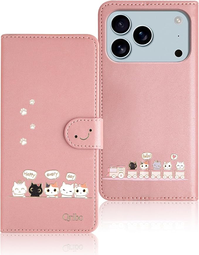 Qribo 適用の iPhone 17 Pro ケース 手帳型 いphone17pro 手帳ケース シンプルなのに可愛いデザイン エンボス加工猫柄 うれしい気持ち 6.3インチ対応 アイフォン17proケース iphone17プロ カバー iPhone17pro スマホケース 薄型 防水 の耐久性 滑り防止 美しい 贈り物 友達 - ピンク