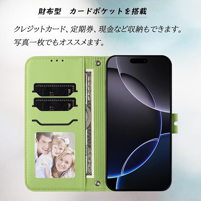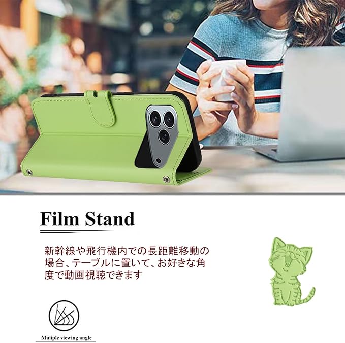 iPhone17Pro ケース 手帳型 iPhone17 Pro カバー あいふぉん手帳型 アイフォン 携帯ケース iPhonecase スマホケース スマホカバー 携帯カバー ストラップ付き カード収納 財布型 ベルトマグネット スタンド機能 かわいい 猫 耐衝撃 全面保護 (iPhone 17 Pro 対応)ライトグリーン