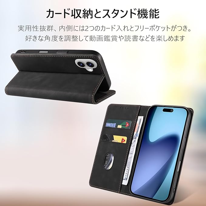 KWATUNG iPhone 17 用 ケース 手帳型 アイフォン 17 用 ケース 手帳型 おしゃれ あいふおん17用 手帳型ケース 肌感レザー 内蔵マグネット 耐衝撃 iPhone 17用 スマホケース 手帳型 カード収納 スタンド機能 全面保護 アイホン17 用 6.3インチ ブラック