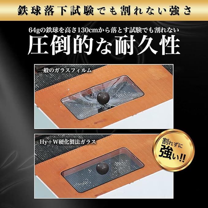 【鉄球落下テストで実証実験済み】130cmの高さから64gの鉄球を3度落下させるテストに合格!従来の強度のガラスフィルムは落下1回目で割れてしまうのに対し、W硬化製法ガラスフィルムは3度の落球でも割れない強さ。大切なスマホ画面をしっかりガードします。