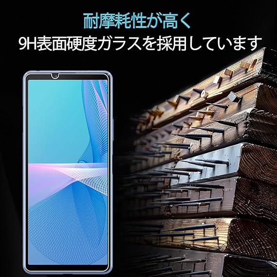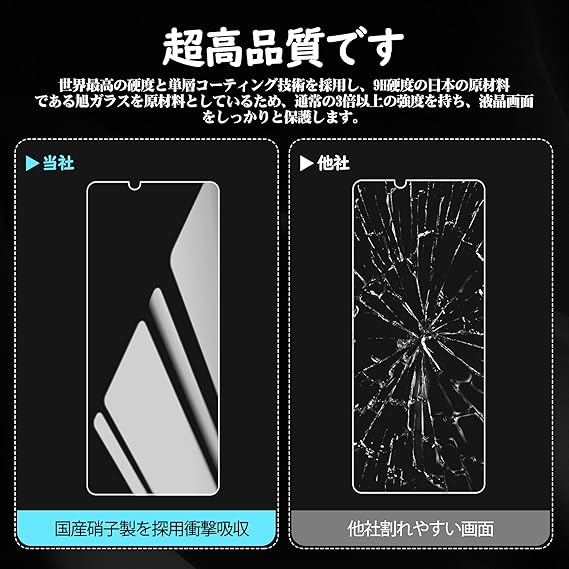 【9H硬度・日本製ガラス素材】日本旭硝子製ガラス素材採用 最上級強度のガラスを使用し表面硬度は9H。万が一スマホを落としてガラスが割