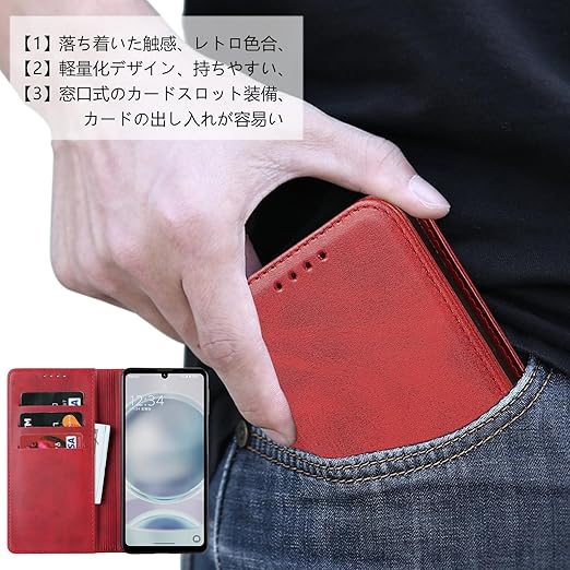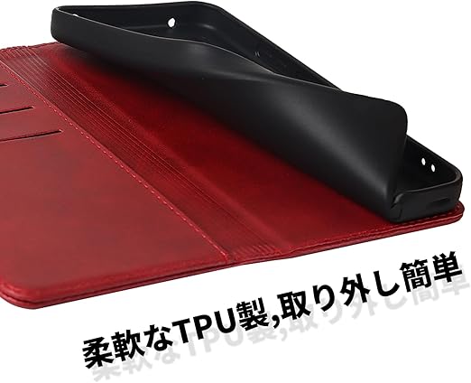 【ポイント②】:マグネット内蔵式のケースです、留め具なしでシンプルなデザイン感をよりアップさせます。表面は手触りの合成レザーです、内部の柔軟なTPUホルダーは衝撃吸収の性能が抜群で、万が一の落下した時、大切なスマホ本体をしっかり守ることができます。