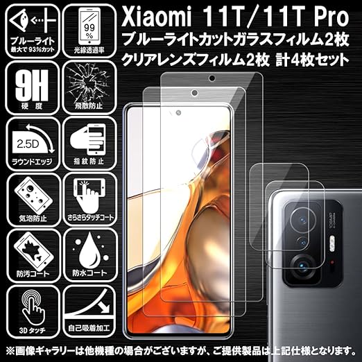【ブルーライトカット 93%】2枚+2枚 RISE ガラスフィルム カメラ レンズ フィルム Xiaomi 11T/11T Pro 用 保護フィルム 強化 ガラス 高透過 高光沢 日本製 旭硝子 硬度9H 2.5Dラウンドエッジ 自動吸着 気泡ゼロ 飛散防止 指紋防止 撥水撥油 3D タッチ For Xiaomi 11T/11T Pro a