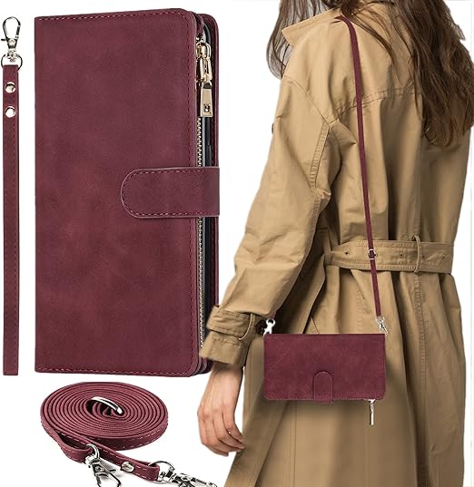 【実用性①:収納力抜群】カード収納が沢山あります。ファスナー式の小銭入れ、窓口式のカード入れ、カードスロット複数付き、それにピタッと閉じるマグネット式の留め具とスナップ式のプリップにより、大事なカードたちを完全に保護します。ちょっとした買い物や散歩にはショルダーにして、スマホだけで出掛けて十分です。
