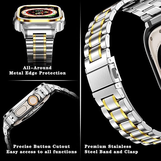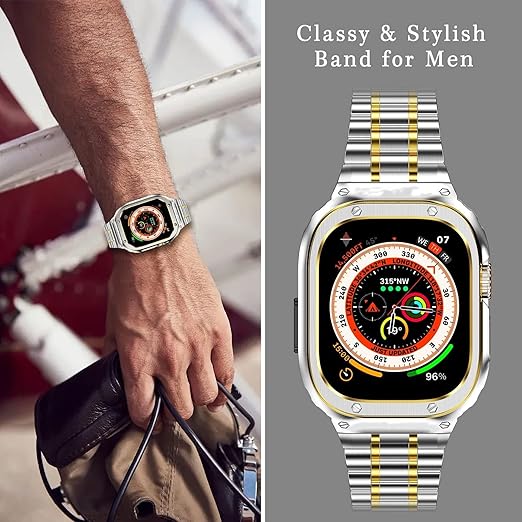MioHHR ステンレススティール製バンド、ケース互換性 Apple Watch Bands 49mm,金属製保護バンパーカバー付き頑丈なストラップ iWatch Ultra 3 2 1 男性用 (銀金) a