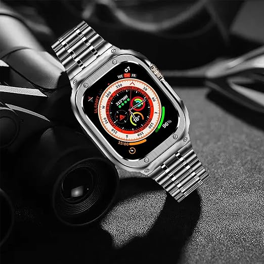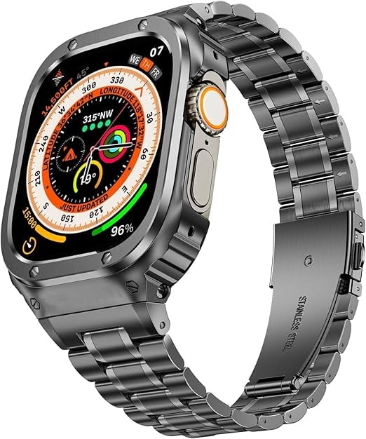 【互換性】このケース/バンドはApple WatchシリーズUltra 3/2/1 (49mm) に対応しています。腕時計バンドは手首サイズ6.5インチ~8.13インチに適しています。交換用バンドは付属のリンク取り外しツールを使って手首にぴったりフィットするように短くしたり伸ばしたりできます。取り外し可能なのは矢印の付いたチェーンのみです。損傷を防ぐため、正しい手順に従ってバンドを取り外してください。(アップルウォッチは含まれていません)